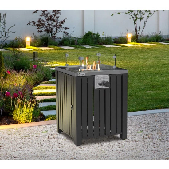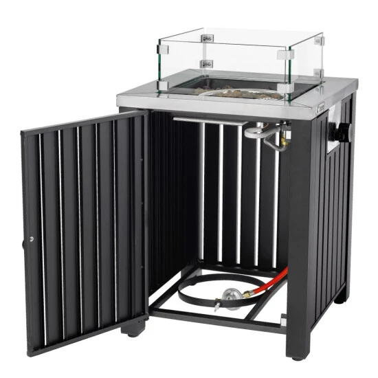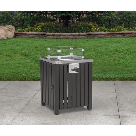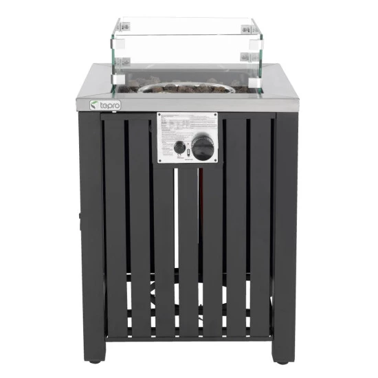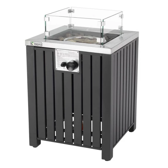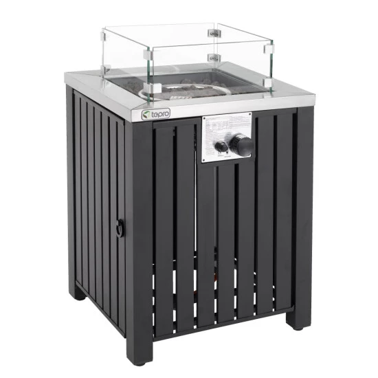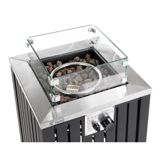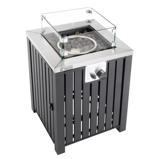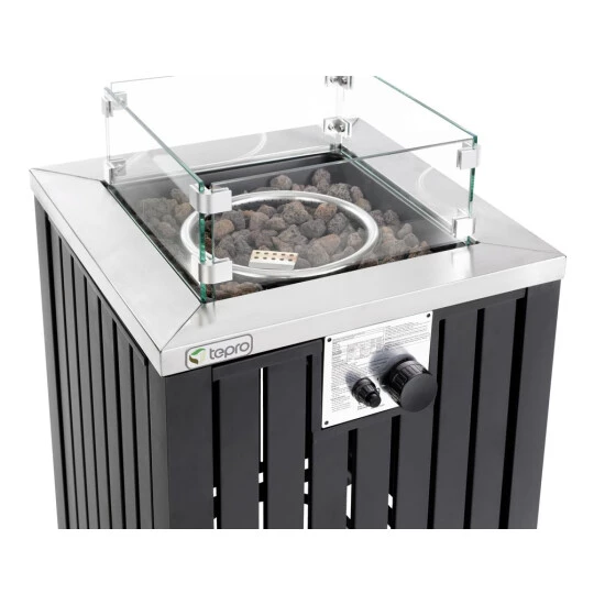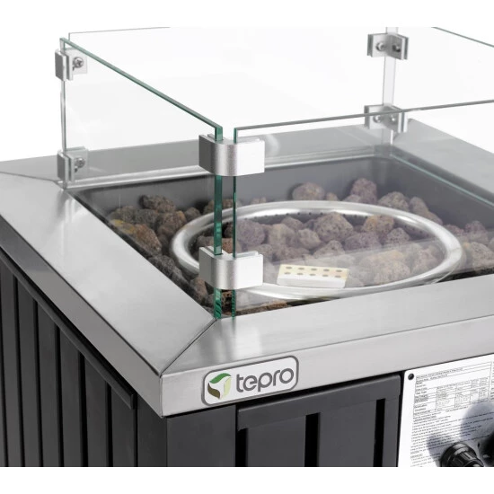 Die Tepro Gasfeuerstelle Topeka schafft ein angenehmes Ambiente und sorgt für gemütliche Stimmung. Durch die elektrische Piezozündung ist die Handhabung einfach und unkompliziert – auf Knopfdruck entfacht sich das Feuer. Das integrierte Staufach bietet Platz für 5kg-Gasflaschen. Durch die Glasumrandung und den Edelstahlbrenner verfügt die Gasfeuerstelle über eine hochwertige Optik. Lieferung inkl. Gasschlauch und Abdeckhaube. Farbe: anthrazit Maße: B/T/H: 50 x 50 x 78 cmEdelstahl-Brenner, ca. 13 kWpulverbeschichtetes Gehäuseelektrische Piezo-Zündung (Batterie nicht im Lieferumfang)inklusive AbdeckhaubeGasflaschenhalter im Gehäuseinklusive Schlauch und Reglerinklusive Lavasteine