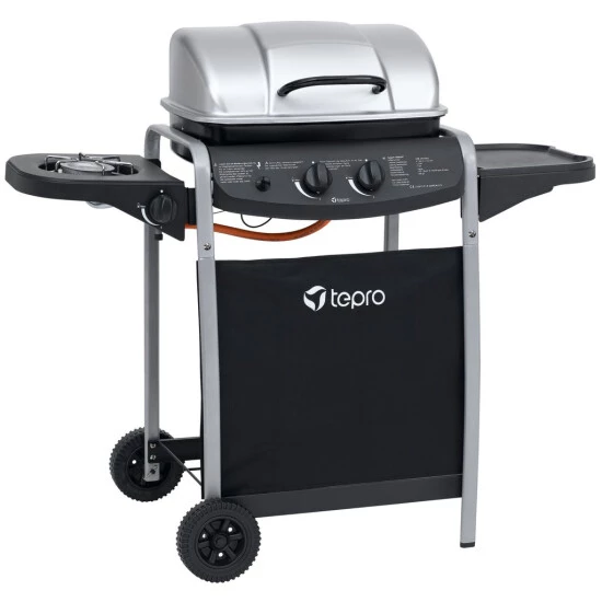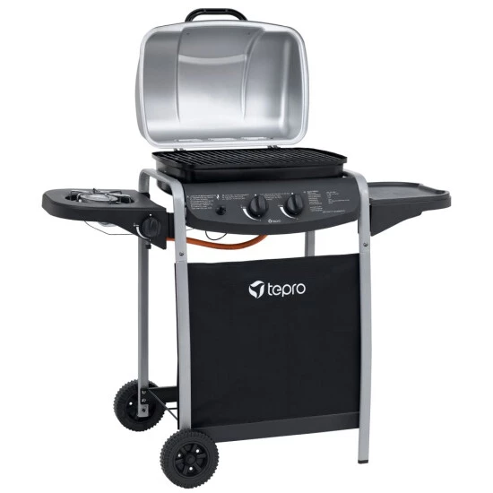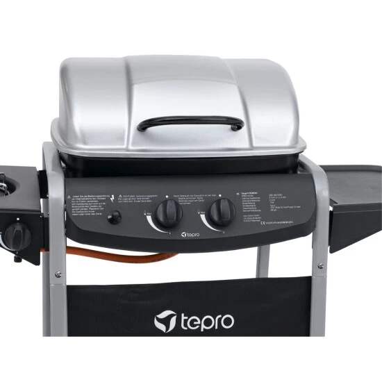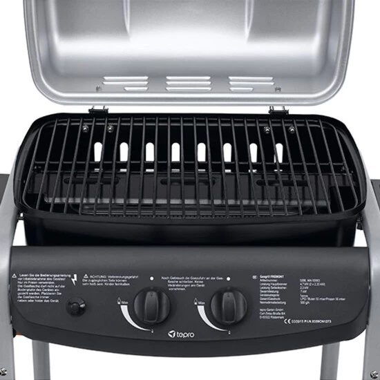 Der Gasgrill Fremont von tepro bietet eine Gesamtleistung von 700 Watt und verfügt über eine Piezo-Zündung. Die Grillfläche hat das Maß von ca. 45 x 34 cm und wird durch ein emailliertes Grillrost sowie eine Flammschutzplatte komplettiert. Zur weiteren Ausstattung gehören eine lackierte Feuerwanne, ein Deckel mit Kunststoffgriff sowie eine aufklappbare Seitenablage. Zwei große Räder sorgen für einen leichten Transport. Die Arbeitshöhe beträgt ca. 80 cm.