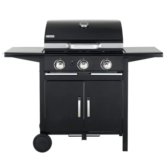 Tepro Gasgrill Mayfield 1 verchromter Warmhalterost 2 verchromte Gillroste 3 Edelstahl-Brenner emaillierte Flammschutzplatten lackierter Deckel mit Griff Thermometer lackierte Seitenablagen hitzefest lackierte Feuerwanne lackiertes Frontpanel lackierter Trolley mit 2 lackierten Türen 2 Kunststoffräder mit Radkappen Gasflaschenhalterung im Trolley Besteckhaken inkl. Schlauch und Regler Technische Daten: elektrische Zündung (1,5 V AA, Batterie nicht im Lieferumfang enthalten) 3 Edelstahl-Brenner, je ca. 3 kW Gesamtleistung max. 9 kW Grillfläche: ca. 55 x 44 cm Warmhaltefläche: ca. 54 x 24 cm 2 verchromte Grillroste, je ca. 27,5 x 44 cm Arbeitshöhe ca. 80 cm Außenmaße: ca. B 127 cm x T 58 cm x H 103 cm Nettogewicht: 28 kg Farbe: schwarz