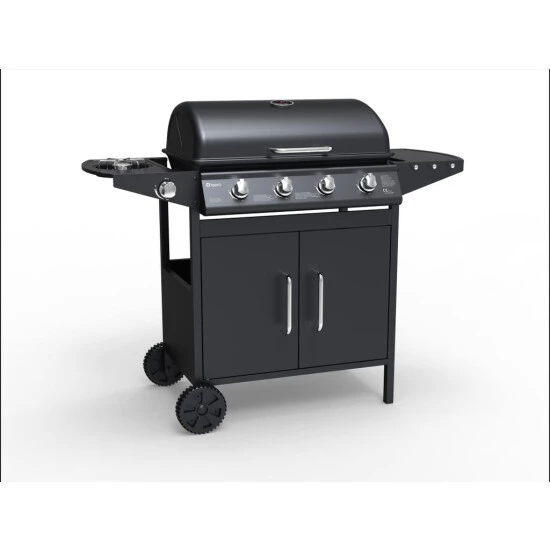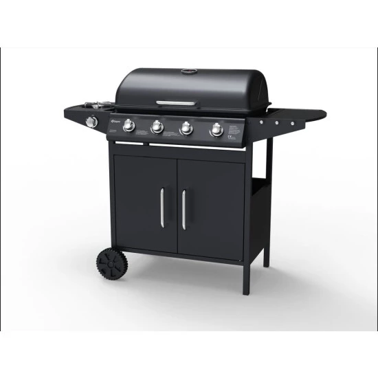 *- 4 Edelstahl-Brenner, je ca. 2,9 kW – 1 Seitenbrenner, ca. 2,5 kW – Gesamtleistung max. 14,1 kW – Grillfläche: ca. 63 x 37 cm – 1 emaillierter Grillrost – 1 emaillierter Warmhalterost – aluminiumbeschichtete Flammschutzplatten – pulverbeschichteter Deckel mit Griff aus Edelstahl – Thermometer – pulverbeschichtete Seitenablagen- pulverbeschichtete Feuerwanne – pulverbeschichtetes Frontpanel – pulverbeschichteter Trolley mit 2 Türen – 2 Kunststoffräder – 3 Besteckhaken – Arbeitshöhe ca. 82 cm – integrierte Piezo-Zündung im Drehregler – inkl. Schlauch und Regler – Nennwertbelastung: 1010 g/h