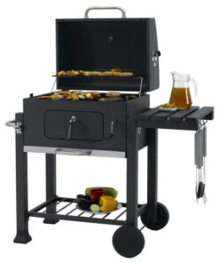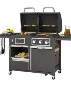 Zwei Kunststoffräder und ein für Grillwagen überschaubares Gewicht von 36,26 kg runden das Design unseres Multitalents ab. Mit praktischen Details wie einer Fronttüre, die sich auf Druck öffnet, einem Flaschenöffner, einer Gasflaschenhalterung und Edelstahl-Seitenablagen hast du den nächsten Grillabend voll unter Kontrolle. Die Edelstahl-Brenner werden bequem über eine Piezo-Zündung aktiviert.