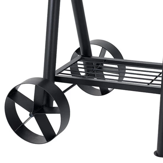 Dieser schwarze Grill bietet eine Grillfläche mit Maßen von ca. 64,5 x 43,5 cm. Die drei Grillroste sind emailliert. Der Stahldeckel verfügt über einen Metallgriff und ein Thermometer. Die lackierte Feuerwanne ist hitzefest. Der Grill verfügt über einen Kaminabzug, eine abklappbare Frontablage mit Besteckhaken, eine regelbare Luftzufuhr und einen Ascheschieber. Die großen Stahlräder sorgen für Mobilität. Die Arbeitshöhe beträgt ca. 88 cm und die Kohleschale fasst bis zu 2,3 kg Kohle.