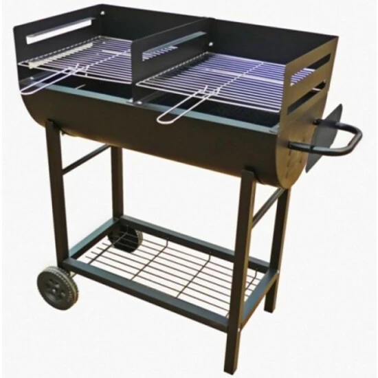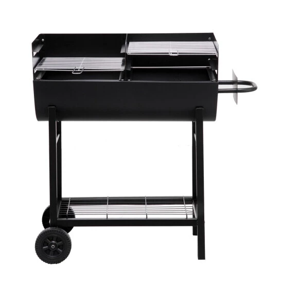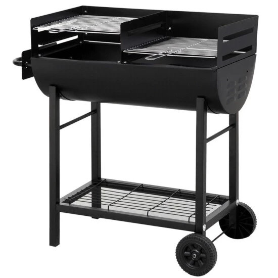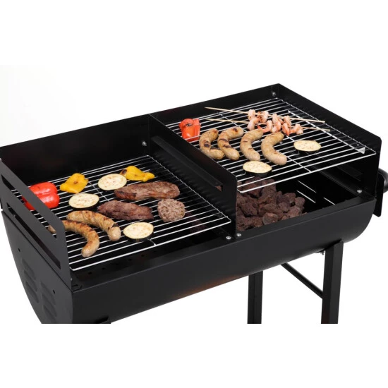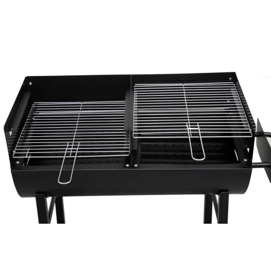 Der Ölfassgrill Detroit von Tepro ist mit zwei ca. 35 x 37 cm großen Grillflächen sowie zwei verchromten Grillrosten mit Griffen ausgestattet. Der Windschutz, die Stahlfeuerwanne und die Holzkohlebleche verfügen über eine hitzefeste Lackierung. Der Ölfassgrill ist leicht zu transportieren, da er auf der einen Seite über Rollen verfügt. Im unteren Bereich ist außerdem eine Ablagefläche angebracht, auf der das Grillwerkzeug ablegt oder weiterer Grillnachschub gelagert werden kann. Die dreifach verstellbare Arbeitshöhe kann auf ca. 77, 83 oder 89 cm reguliert werden.