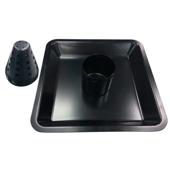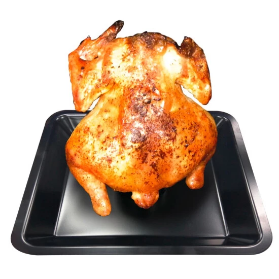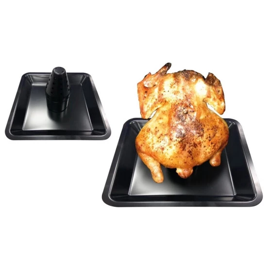 Mit diesem Hähnchenaufsteller gelingt ein knuspriges Hähnchen im Nu. Die Fettauffangschale ist antihaftbeschichtet und hat einen extra hohen Rand, damit auch nichts daneben geht. Der Aufsteller wird inklusive Aromabehälter geliefert, welcher über einen abnehmbaren Deckel verfügt.