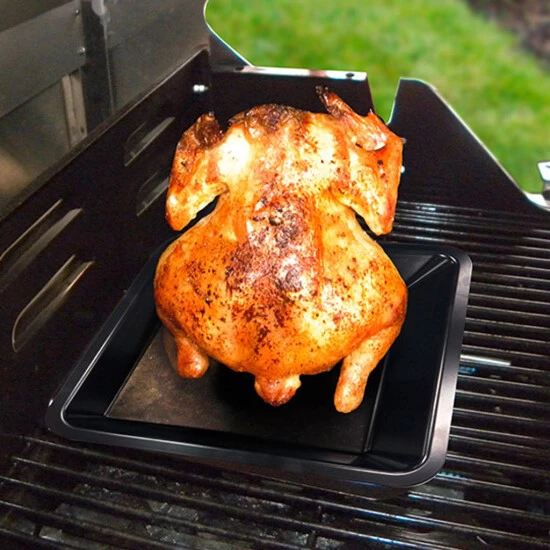 Besonders knusprig wird das Fleisch beim indirekten Grillen mit geschlossenem Deckel. So gart das Hähnchen gleichmäßig von allen Seiten und bekommt eine schöne, krosse Kruste. Die Fettauffangschale mit einer Größe von 20×20 cm und extra hohem Rand sorgt dafür, dass kein Fett in die Glut tropfen kann.
