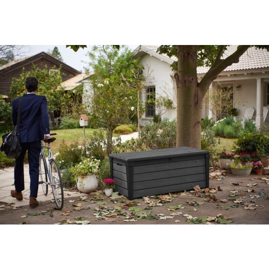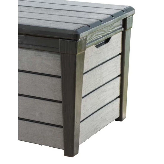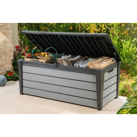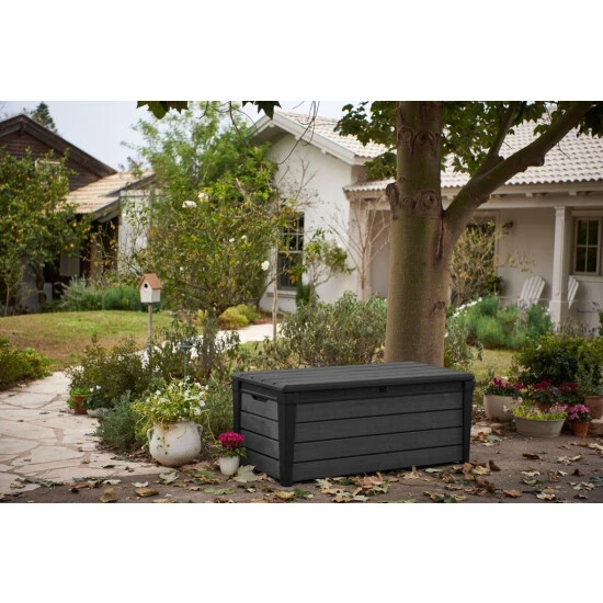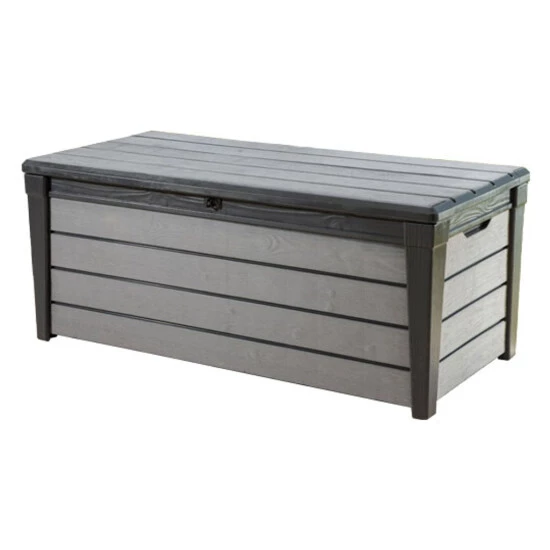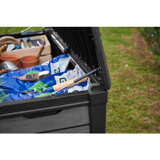 Die Brushwood Box in der Farbe Anthrazit verbindet die raue Holz-Ästhetik mit der praktischen Seite von Kunststoff. Sie besteht aus hochwertigem, Wetter- und UV-beständigem Polypropylen und hat ein Fassungsvermögen von ca. 455 l. Die Box hat das Maß von ca. 145 x 60,3 x 69,7 cm. Die maximale Deckelbelastung liegt bei ca. 365 cm. Das maximale Ladegewicht beträgt ca. 50 kg.
