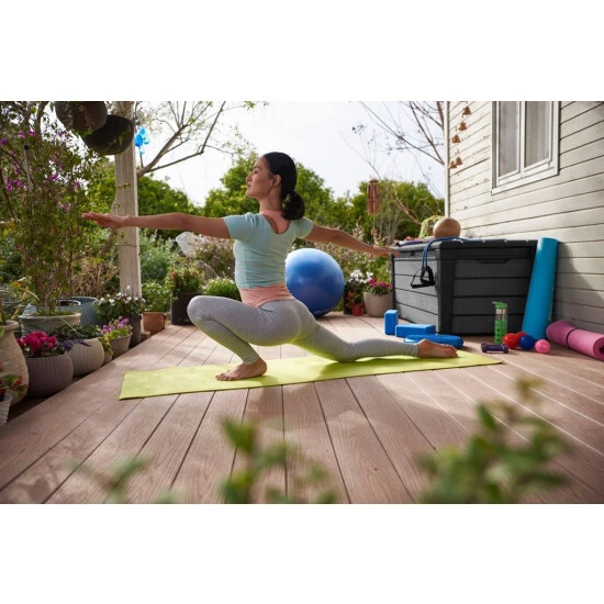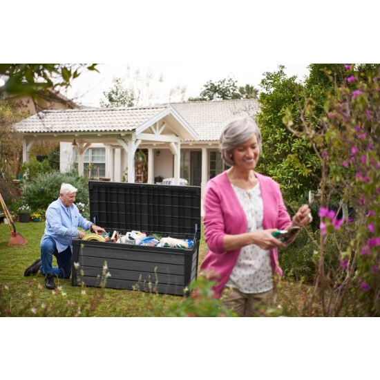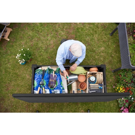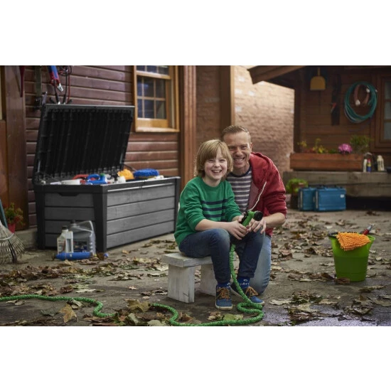 Die praktische Keter Aufbewahrungsbox ist die ideale Aufbewahrungsmöglichkeit für alle Utensilien in Haus und Garten. Mit ihrer natürlich rauen Holzoptik und der streichbaren Oberfläche lässt sie sich individuell gestalten. Gleichzeitig können bequem 2 Erwachsene auf dieser Box Platz nehmen für zusätzliche Sitzgelegenheit ist somit gesorgt. Ob Stuhlauflagen oder andere Gartenaccessoires, alles lässt sich einfach und sicher in der geräumigen und stabilen Box verstauen.