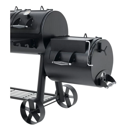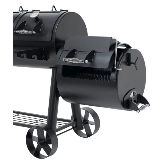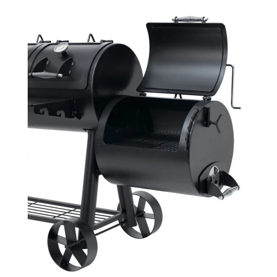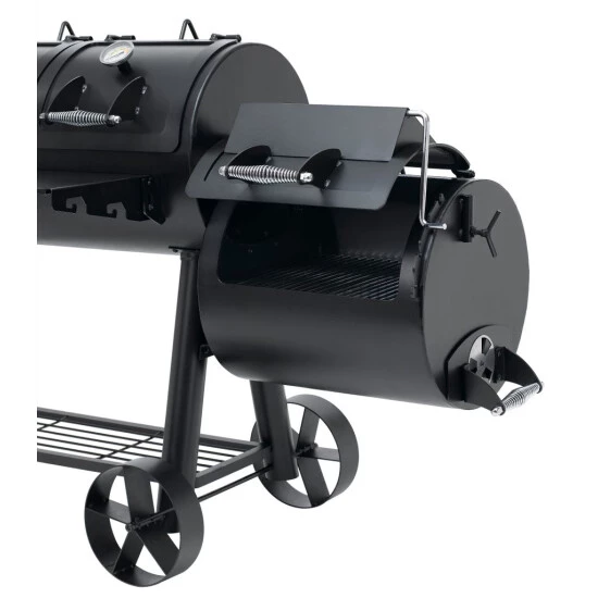 Der massive Smoker im Western Style verbindet verschiedene Grillmöglichkeiten. So kann zum einen das Grillgut traditionell auf der vorgesehenen Grillfläche direkt über der Glut zubereitet werden. Zum anderen kann das Fleisch auch in der Abluft eines Holzfeuers gegart werden. Dies ist möglich durch die spezielle Bauform des Smokers. In dem kleineren und etwas tieferen Feuerraum entsteht Rauch beim Verbrennen von Holz. Dieser Rauch steigt auf und gelangt in der größeren Garkammer, in welchem sich das Grillgut befindet. Der Weg des Rauches wird durch den Kaminabzug in der Garkammer unterstützt. Das Grillgut wird somit bei niedriger Temperatur von 80° bis 130°C schonend gegart und erhält seinen charakteristischen Rauchgeschmack. Oft wird dies auch als „Räuchern“ bezeichnet. Durch das Zubereiten im Rauch wird das Grillgut gleichmäßig von allen Seiten gegart und behält seine saftige Konsistenz. Über die Wahl des Holzes lassen sich neue und unbekannte Geschmacksrichtungen ausprobieren. Die geschmacksverleihende Intensität des Rauches kann durch die Belüftungsklappen geregelt werden.
