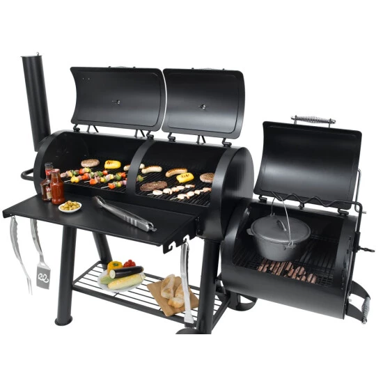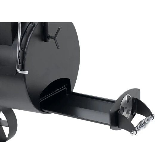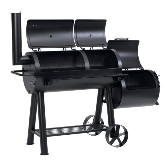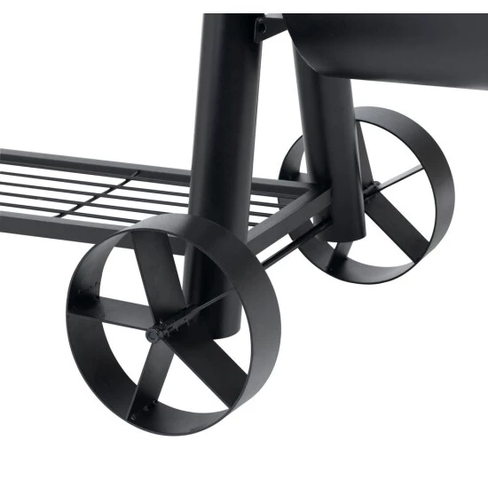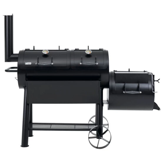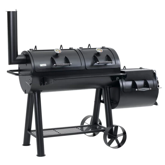 Der Massiv Smoker Indianapolis von tepro hat ein Kohlefassungsvermögen von ca. 2 bzw. 4 kg und verfügt über eine herausnehmbare Ascheauffangschale sowie einen Kaminabzug. Die Haupt-Brennkammer bietet eine Grillfläche von ca. 97,5 x 44 cm und vier emaillierte Guss-Grillroste. Der Stahldeckel ist zweigeteilt und je mit einem Metallgriff sowie einem Thermometer versehen. Zur Ausstattung der Seiten-Brennkammer gehören eine Grillfläche von ca. 48 x 43 cm sowie zwei emaillierte Guss-Grillroste. Auch hier ist ein Stahldeckel mit einem Metallgriff vorhanden. Außerdem verfügt der Grill über eine Seitenablage mit Besteckhacken, einen Flaschenöffner. Zwei große Stahlräder sorgen für einen leichten Transport. Die Arbeitshöhe beträgt ca. 87 cm.