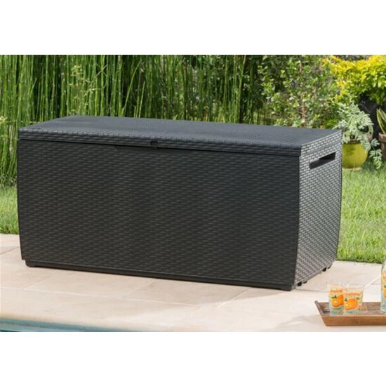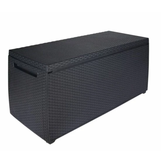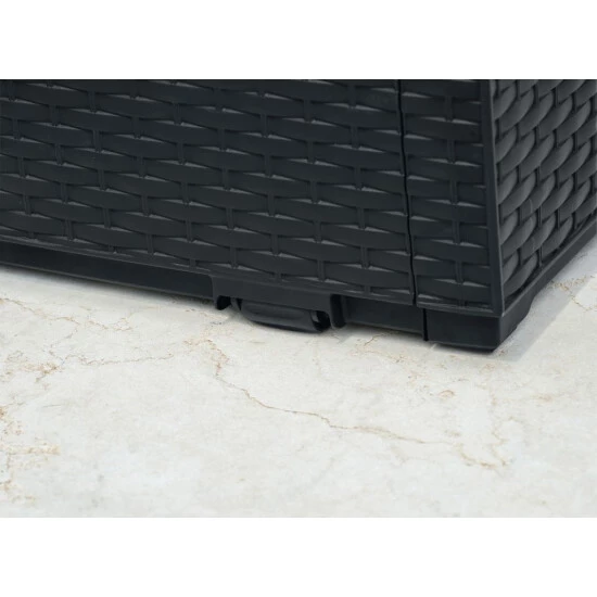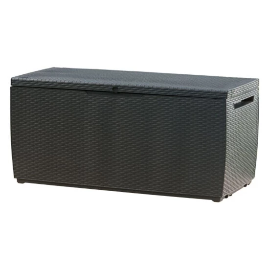 | Rattan Style Box Capri 305 Liter Auflagen- und Universalbox in Rattanoptik – aus hochwertigem Polypropylen – Wetter- und UV-beständig – Nutzinhalt ca. 305 Liter – inklusive Rollen zum Fortbewegen – abschließbar (Schloss nicht im Lieferumfang enthalten) – in Rattanoptik – einfache Montage – max. Deckelbelastung: ca. 250 kg – max. Ladegewicht: ca. 40 kg |