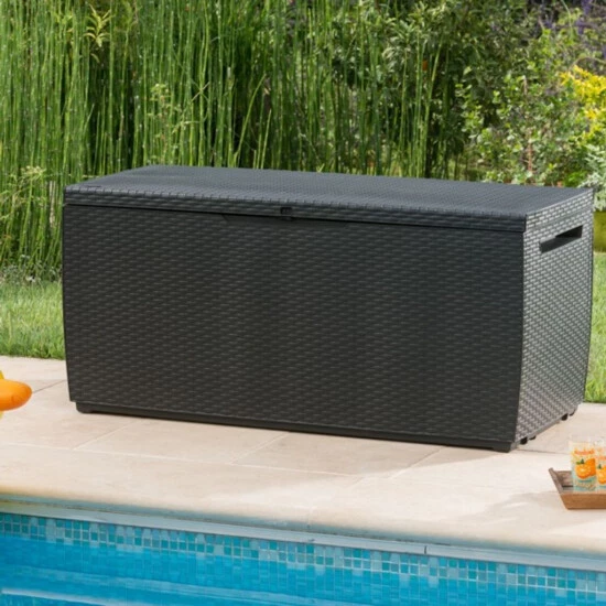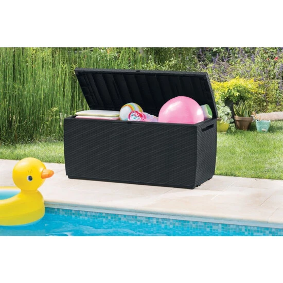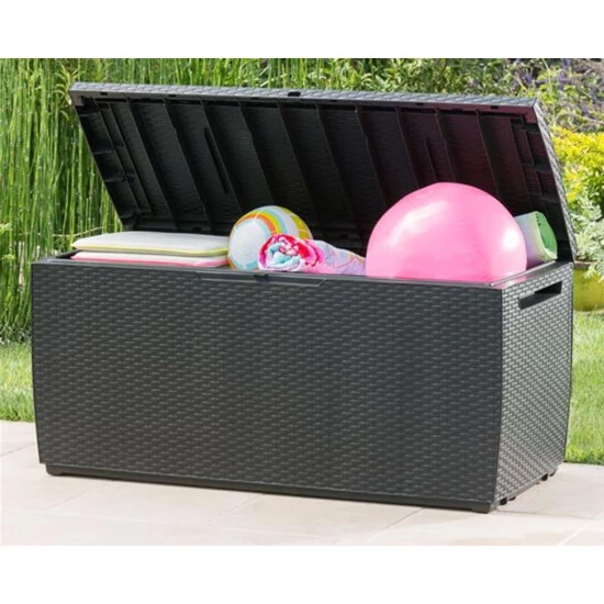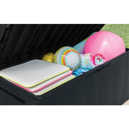 Die kleine Aufbewahrungsbox in modernem Rattandesign ist ideal für kleine Gärten, Balkons oder Terrassen, denn durch zwei integrierte Rollen und integrierte Griffe lässt sich die Box leicht transportieren. Neben der praktischen Sitzfunktion bietet die Box ausreichend Platz für Ihre Gartenutensilien und schützt diese sicher vor Wind und Regen. Die Box ist besonders wetter- und UV-beständig, sodass Sie möglichst lange Freude an ihr haben.Lieferumfang: inklusive Rollen zum Fortbewegen, Schloss nicht im Lieferumfang enthalten.Material: PolypropylenNutzinhalt: 305 LiterWetter- und UV-beständigmax. Deckelbelastung: 250 kgin Rattanoptikeinfache Montageabschließbarmax. Ladegewicht: 40 kgWetter- und UV-beständig