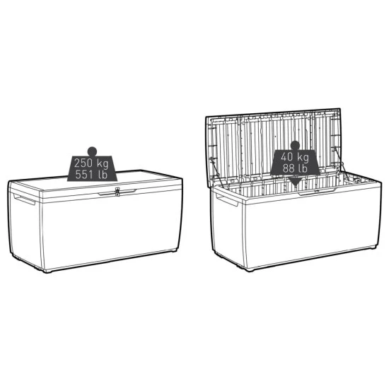 Sie ist aus haltbarem und witterungsbeständigem PP-Kunststoff gefertigt, hat ein Speichervolumen von 302 L und kann ein Gewicht von bis zu 250 kg auf dem Deckel tragen. Die Montage ist einfach. Die integrierten Griffe und Rollen ermöglichen eine einfache Mobilität.
